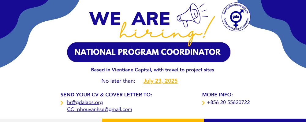 Applicants should submit a cover letter and CVs with proof of experience with two references.  All documents must be submitted by July 23, 2025 to the e-mail: info@gdalaos.org by email only. Please CC phouvanhse@gmail.com   Please include "Application – National Program Coordinator" in the title of your email.