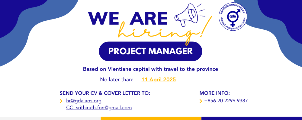 GDA is looking for a project manager. The project manager works closely with the program manager and takes a leading role in ensuring the successful project implementation. This includes the collaboration with the government partners (provincial and district levels) and target communities as well as other stakeholders: INGOs, and Lao CSOs. This position will carry out the activities related to Food insecurity, Nutrition, Poverty and Climate resilience, consultation meetings, awareness-raising events and so on at community, district, and provincial level.